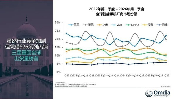 【CNMO科技消息】4月30日,Omdia数据显示,2026年第一季度,全球手机出货量达2.985亿台,同比增长1%。CNMO科技注意到,三星重回全球出货量榜首。