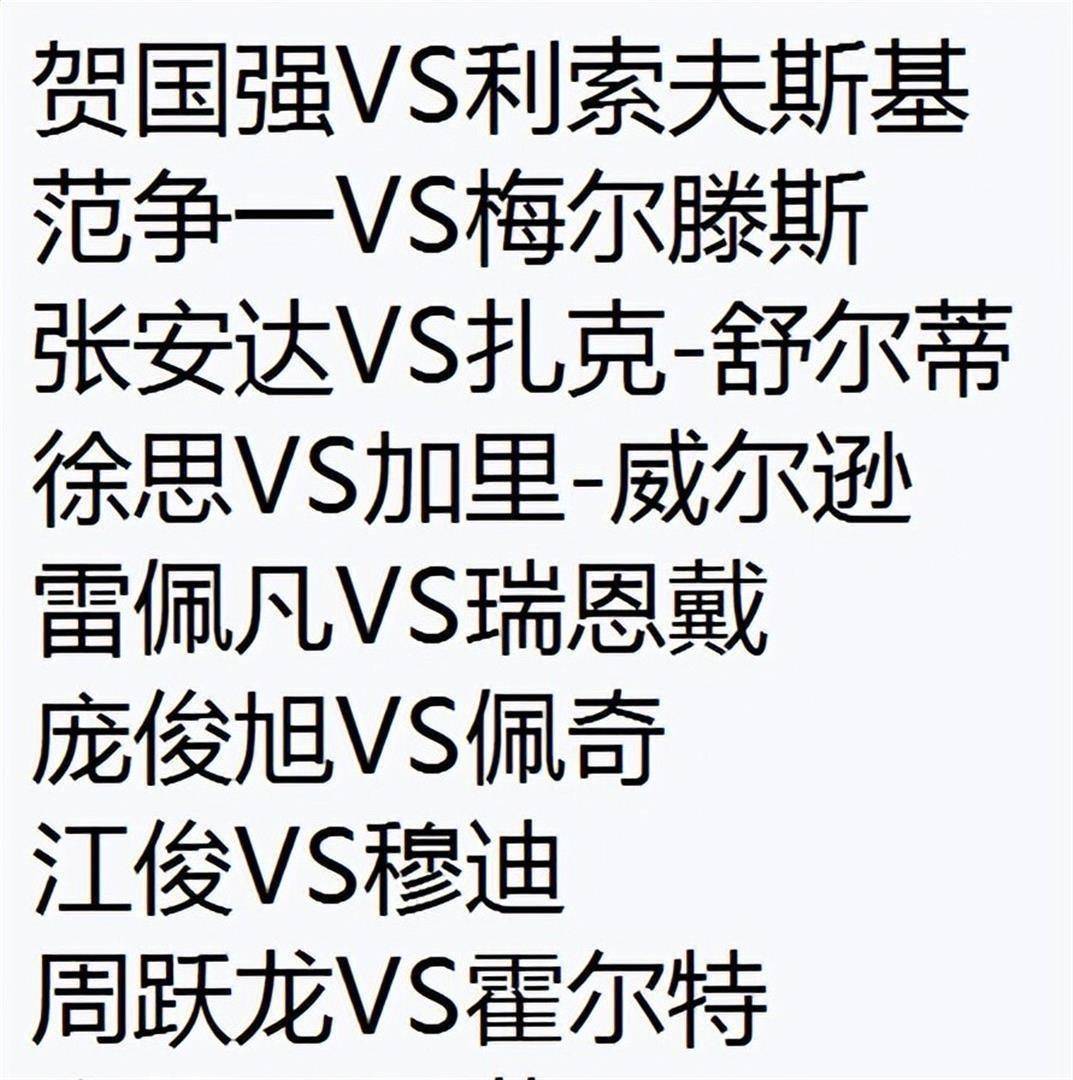 雷佩凡的对手是经验丰富的瑞恩·戴;徐思将面对加里·威尔逊;张安达对阵舒尔第;范争一与默滕斯交锋;而贺国强则将迎来巨大考验,他的对手是实力强劲的利索夫斯基。 每一组对决都谈不上轻松,多位中国球员的对手世界排名和大赛经验都在自己之上。 例如,贺国强对阵利索夫斯基、徐思对阵加里·威尔逊,都被外界视为下风球。